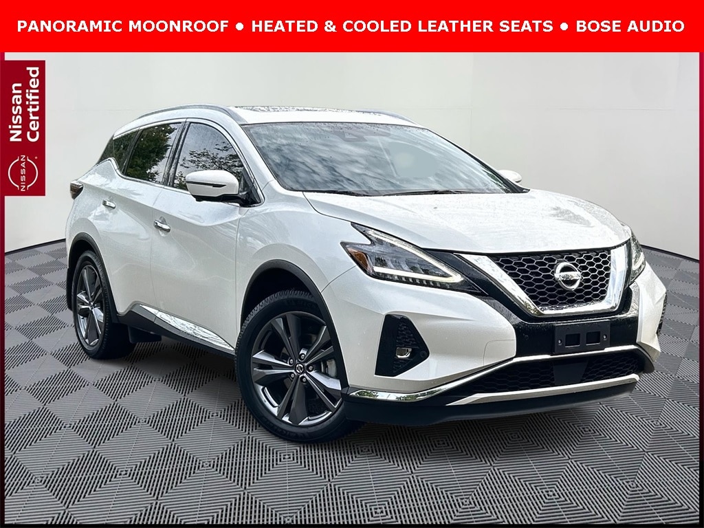 The full list of features includes: Cargo Package (Cargo Area Protector, Cargo Net, First Aid Kit, and Retractable Cargo Cover), Nissan Certified Certified, CVT with Xtronic, 11 Speakers, 4-Wheel Disc Brakes, 4.667 Axle Ratio, ABS brakes, Air Conditioning, Alloy wheels, AM/FM radio: SiriusXM, AM/FM/CD/MP3/WMA Audio System, Auto High-beam Headlights, Auto tilt-away steering wheel, Auto-dimming Rear-View mirror, Automatic temperature control, Blind Spot Warning, Brake assist, Bumpers: body-color, Carpeted Floor Mats & Carpeted Cargo Mat, CD player, Child-Seat-Sensing Airbag, Cruise Control, Delay-off headlights, Driver door bin, Driver vanity mirror, Dual front impact airbags, Dual front side impact airbags, Electronic Stability Control, Emergency communication system: NissanConnect Services (first 6 months included), Exterior Accent Lighting, Exterior Parking Camera Rear, Four wheel independent suspension, Front anti-roll bar, Front Bucket Seats, Front Center Armrest, Front dual zone A/C, Front fog lights, Front reading lights, Fully automatic headlights, Garage door transmitter: HomeLink, Heated & Ventilated Front Bucket Seats, Heated front seats, Heated rear seats, Heated Side View Mirrors, Heated steering wheel, Illuminated entry, Illuminated Kick Plates, Illuminated Kick Plates (PIO), Interior Accent Lighting, Knee airbag, Low tire pressure warning, Memory seat, Navigation system: NissanConnect Navigation, NissanConnect featuring Apple CarPlay and Android Auto, NissanConnect Services Powered By SiriusXM, Occupant sensing airbag, Outside temperature display, Overhead airbag, Overhead console, Panic alarm, Passenger door bin, Passenger vanity mirror, Power door mirrors, Power driver seat, Power Liftgate, Power Panoramic Moonroof, Power passenger seat, Power steering, Power windows, Premium audio system: Bose, Radio data system, Rear anti-roll bar, Rear Bumper Protector, Rear reading lights, Rear seat center armrest, Rear side impact airbag, Rear window defroster, Rear window wiper, Remote keyless entry, Roof rack: rails only, Security system, Semi-Aniline Leather-Appointed Seat Trim, Speed-sensing steering, Speed-Sensitive Wipers, Splash Guards (B92), Split folding rear seat, Spoiler, Steering wheel memory, Steering wheel mounted audio controls, Tachometer, Telescoping steering wheel, Tilt steering wheel, Traction control, Trip computer, Turn signal indicator mirrors, Variably intermittent wipers, Ventilated front seats, and Wheels: 20" Unique Dark Hyper Silver.