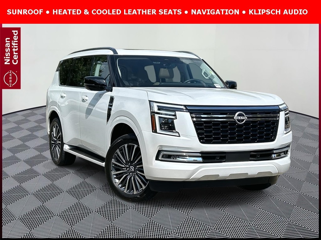 The full list of features includes: Nissan Certified Certified, 4WD, 12 Speakers, 3rd row seats: split-bench, 4-Wheel Disc Brakes, ABS brakes, Adaptive suspension, Air Conditioning, Alloy wheels, AM/FM radio: SiriusXM, Anti-whiplash front head restraints, Auto High-beam Headlights, Auto tilt-away steering wheel, Auto-dimming door mirrors, Auto-dimming Rear-View mirror, Auto-leveling suspension, Automatic temperature control, Brake assist, Bumpers: body-color, Climate Controlled Heated & Ventilated Front Seats, Cruise Control, Delay-off headlights, Driver door bin, Driver vanity mirror, Dual front impact airbags, Dual front side impact airbags, Electronic Stability Control, Emergency communication system: NissanConnect Services, Four wheel independent suspension, Front anti-roll bar, Front Bucket Seats, Front Center Armrest, Front dual zone A/C, Front fog lights, Front reading lights, Fully automatic headlights, Garage door transmitter: myQ Connected Garage, Genuine wood dashboard insert, Heads-Up Display, Heated front seats, Heated rear seats, Heated Side View Mirrors, Heated steering wheel, HVAC memory, Illuminated entry, Knee airbag, Leather steering wheel, Low tire pressure warning, Memory seat, Navigation System, Occupant sensing airbag, Outside temperature display, Overhead airbag, Overhead console, Panic alarm, Passenger door bin, Passenger vanity mirror, Power door mirrors, Power driver seat, Power Liftgate, Power Panoramic Moonroof, Power passenger seat, Power steering, Power windows, Quilted Leather Seat Trim, Radio: NissanConnect w/SiriusXM 360L, Rain sensing wipers, Rear air conditioning, Rear anti-roll bar, Rear reading lights, Rear window defroster, Rear window wiper, Reclining 3rd row seat, Remote keyless entry, Security system, Speed-sensing steering, Speed-Sensitive Wipers, Split folding rear seat, Spoiler, Steering wheel memory, Steering wheel mounted audio controls, Tachometer, Telescoping steering wheel, Tilt steering wheel, Traction control, Trip computer, Turn signal indicator mirrors, Variably intermittent wipers, Ventilated front seats, Voltmeter, and Wheels: 22" Painted Alloy.