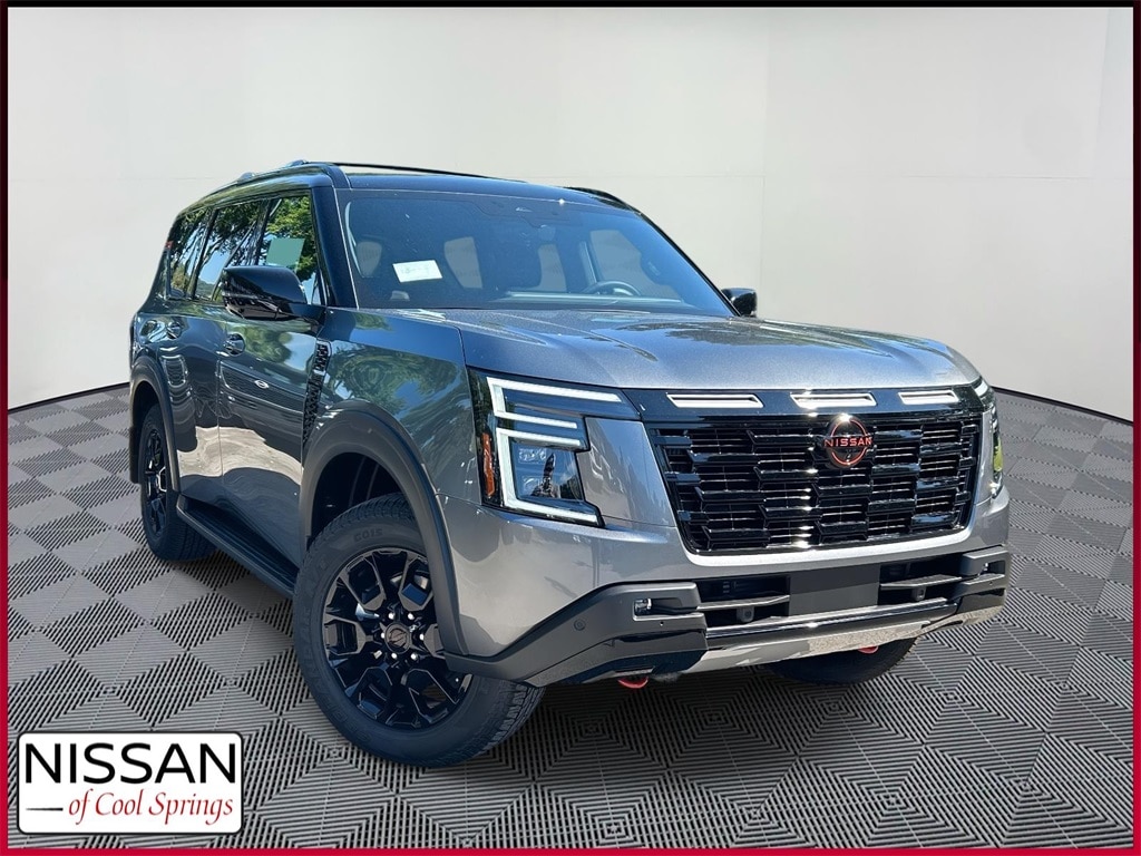 The complete list of features includes: 4WD, ABS brakes, Active Cruise Control, Alloy wheels, Electronic Stability Control, Front dual zone A/C, Heated Front Bucket Seats, Heated front seats, Heated Side View Mirrors, Illuminated entry, Low tire pressure warning, Navigation System, Power Liftgate, Remote keyless entry, Traction control, 12 Speakers, 3rd row seats: split-bench, 4-Wheel Disc Brakes, Adaptive suspension, Air Conditioning, AM/FM radio: SiriusXM, Anti-whiplash front head restraints, Auto High-beam Headlights, Auto tilt-away steering wheel, Auto-dimming door mirrors, Auto-dimming Rear-View mirror, Auto-leveling suspension, Automatic temperature control, Brake assist, Bumpers: body-color, Cruise Control, Delay-off headlights, Driver door bin, Driver vanity mirror, Dual front impact airbags, Dual front side impact airbags, Emergency communication system: NissanConnect Services, Four wheel independent suspension, Front anti-roll bar, Front Bucket Seats, Front Center Armrest, Front fog lights, Front reading lights, Fully automatic headlights, Garage door transmitter: myQ Connected Garage, Genuine wood dashboard insert, Heated steering wheel, HVAC memory, Knee airbag, Leather steering wheel, Memory seat, Occupant sensing airbag, Outside temperature display, Overhead airbag, Overhead console, Panic alarm, Passenger door bin, Passenger vanity mirror, Power door mirrors, Power driver seat, Power passenger seat, Power steering, Power windows, PRO-4X Unique Quilted Leather Seat Trim, Radio: NissanConnect w/SiriusXM 360L, Rain sensing wipers, Rear air conditioning, Rear anti-roll bar, Rear reading lights, Rear seat center armrest, Rear window defroster, Rear window wiper, Reclining 3rd row seat, Security system, Speed-sensing steering, Speed-Sensitive Wipers, Split folding rear seat, Spoiler, Steering wheel memory, Steering wheel mounted audio controls, Tachometer, Telescoping steering wheel, Tilt steering wheel, Trip computer, Turn signal indicator mirrors, Variably intermittent wipers, Voltmeter, and Wheels: 20" Painted PRO-4X Alloy!