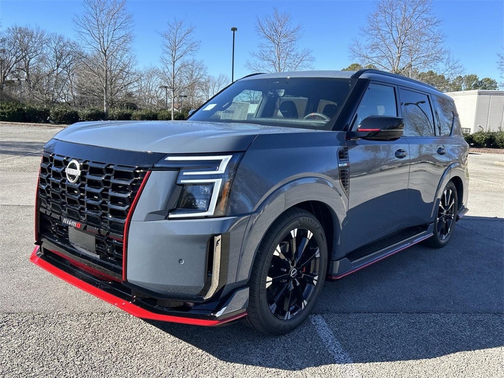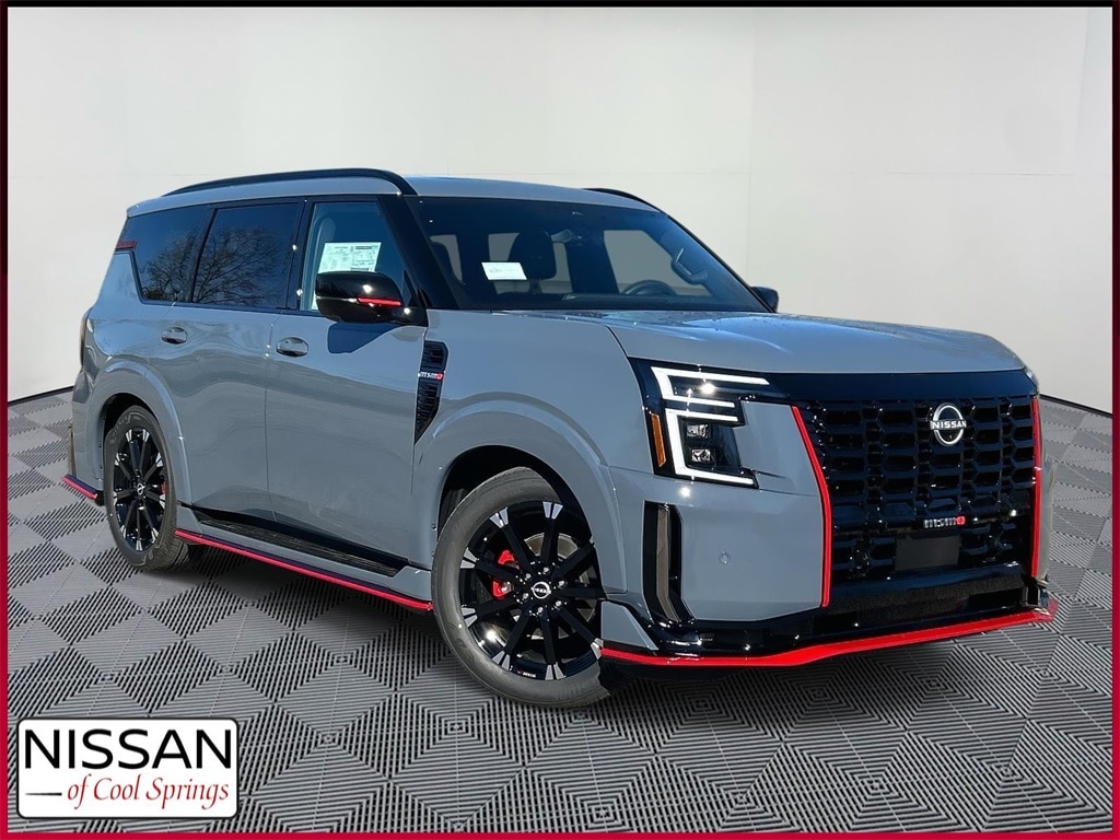 The complete list of features includes: 4WD, 12 Speakers, 3rd row seats: split-bench, 4-Wheel Disc Brakes, ABS brakes, Adaptive suspension, Air Conditioning, Alloy wheels, AM/FM radio: SiriusXM w/360L, Anti-whiplash front head restraints, Apple CarPlay/Android Auto, Auto High-beam Headlights, Auto tilt-away steering wheel, Auto-dimming door mirrors, Auto-dimming Rear-View mirror, Auto-leveling suspension, Automatic temperature control, Brake assist, Bumpers: body-color, Compass, Cruise Control, Delay-off headlights, Driver door bin, Driver vanity mirror, Dual front impact airbags, Dual front side impact airbags, Electronic Stability Control, Emergency communication system: NissanConnect Services, Four wheel independent suspension, Front anti-roll bar, Front Bucket Seats, Front Center Armrest, Front dual zone A/C, Front fog lights, Front reading lights, Fully automatic headlights, Garage door transmitter: HomeLink, Genuine wood dashboard insert, Heated Front Bucket Seats, Heated front seats, Heated Side View Mirrors, Heated steering wheel, HVAC memory, Illuminated entry, Knee airbag, Leather steering wheel, Low tire pressure warning, Memory seat, Navigation system: Google Maps, NISMO Carpeted Floor Mats, Nismo Suede Seat Trim, Occupant sensing airbag, Outside temperature display, Overhead airbag, Overhead console, Panic alarm, Passenger door bin, Passenger vanity mirror, Power door mirrors, Power driver seat, Power Liftgate, Power Panoramic Moonroof, Power passenger seat, Power steering, Power windows, Premium Paint, Radio: NissanConnect with SiriusXM 360L, Rain sensing wipers, Rear air conditioning, Rear anti-roll bar, Rear reading lights, Rear window defroster, Rear window wiper, Reclining 3rd row seat, Remote keyless entry, Security system, Speed-sensing steering, Speed-Sensitive Wipers, Split folding rear seat, Spoiler, Steering wheel memory, Steering wheel mounted audio controls, Tachometer, Telescoping steering wheel, Tilt steering wheel, Traction control, Trip computer, Turn signal indicator mirrors, Variably intermittent wipers, Voltmeter, and Wheels: 22" Forged and Machined Alloy!