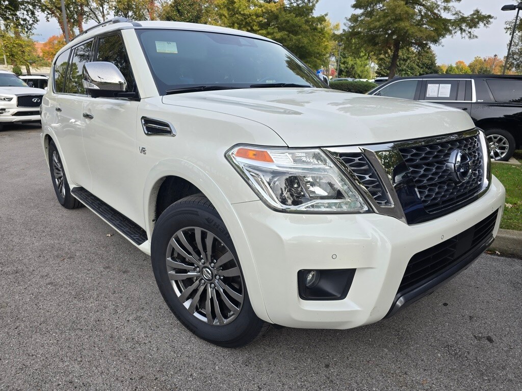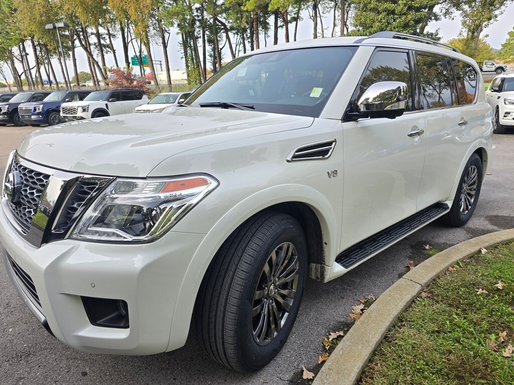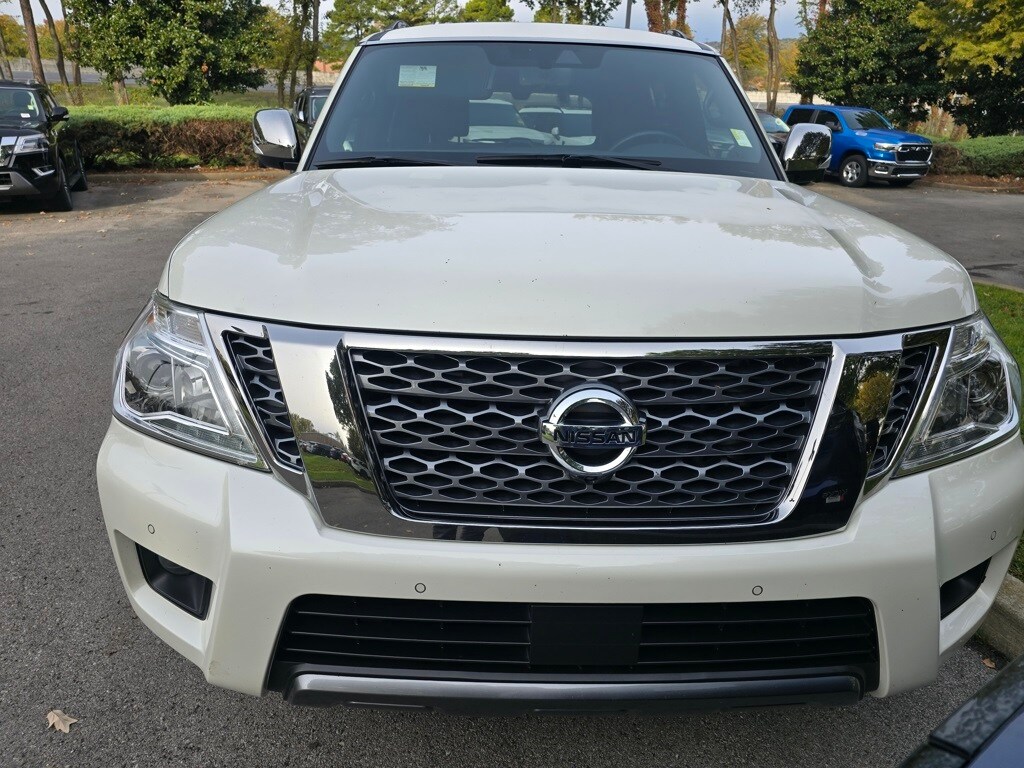 The full list of features includes: 13 Speakers, 2.94 Axle Ratio, 20" Painted Alloy Wheels, 3rd Row Carpeted Floor Mats - Bench Seat, 3rd row seats: split-bench, 4-Wheel Disc Brakes, ABS brakes, Air Conditioning, Alloy wheels, AM/FM radio: SiriusXM, Anti-whiplash front head restraints, Auto High-beam Headlights, Auto tilt-away steering wheel, Auto-dimming door mirrors, Auto-dimming Rear-View mirror, Auto-leveling suspension, Automatic temperature control, Brake assist, Bumpers: body-color, Cross Bars, Cruise Control, Delay-off headlights, Driver door bin, Driver vanity mirror, Dual front impact airbags, Dual front side impact airbags, Electronic Stability Control, Emergency communication system: NissanConnect Services, Exterior Parking Camera Rear, Four wheel independent suspension, Front anti-roll bar, Front Bucket Seats, Front Center Armrest, Front dual zone A/C, Front fog lights, Front reading lights, Fully automatic headlights, Garage door transmitter: HomeLink, Heated Front Bucket Seats, Heated front seats, Heated Side View Mirrors, Illuminated entry, Illuminated Kick Plates, Leather Seat Trim, Leather Shift Knob, Low tire pressure warning, Memory seat, Navigation System, NissanConnect featuring Apple CarPlay and Android Auto, Occupant sensing airbag, Outside temperature display, Overhead airbag, Overhead console, Panic alarm, Passenger door bin, Passenger vanity mirror, Power door mirrors, Power driver seat, Power Liftgate, Power Panoramic Moonroof, Power passenger seat, Power steering, Power windows, Radio: NissanConnect w/SiriusXM, Rear air conditioning, Rear anti-roll bar, Rear reading lights, Rear seat center armrest, Rear window defroster, Rear window wiper, Reclining 3rd row seat, Remote keyless entry, Security system, Special Paint - Aspen White, Speed-sensing steering, Speed-Sensitive Wipers, Split folding rear seat, Spoiler, Steering wheel memory, Steering wheel mounted audio controls, Tachometer, Telescoping steering wheel, Tilt steering wheel, Traction control, Trip computer, Turn signal indicator mirrors, Variably intermittent wipers, and Voltmeter.